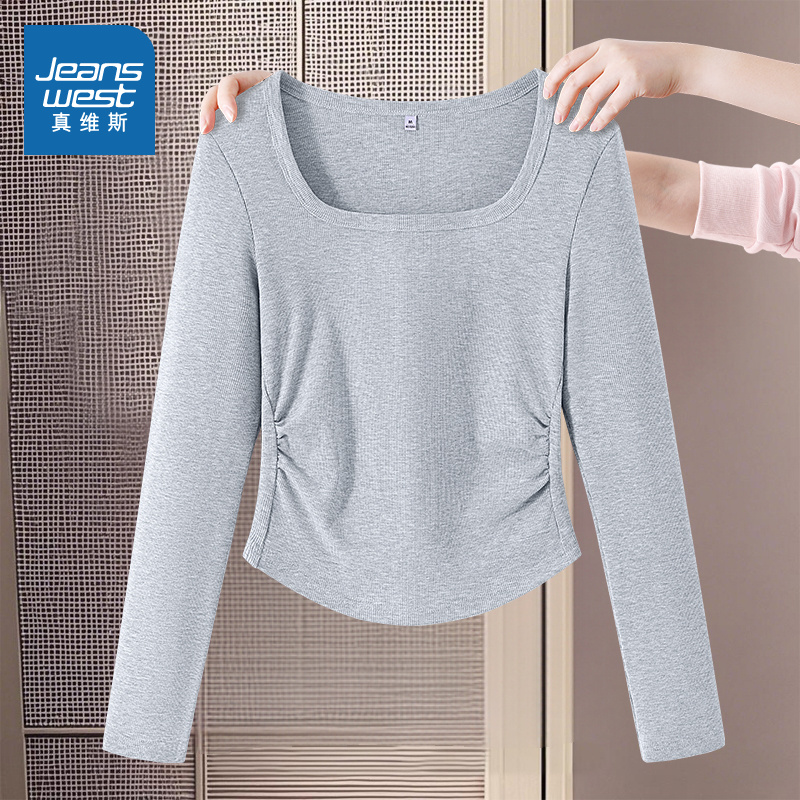 JR真维斯方领修身打底衫女士2025新款秋季u领内搭上衣正肩长袖t恤