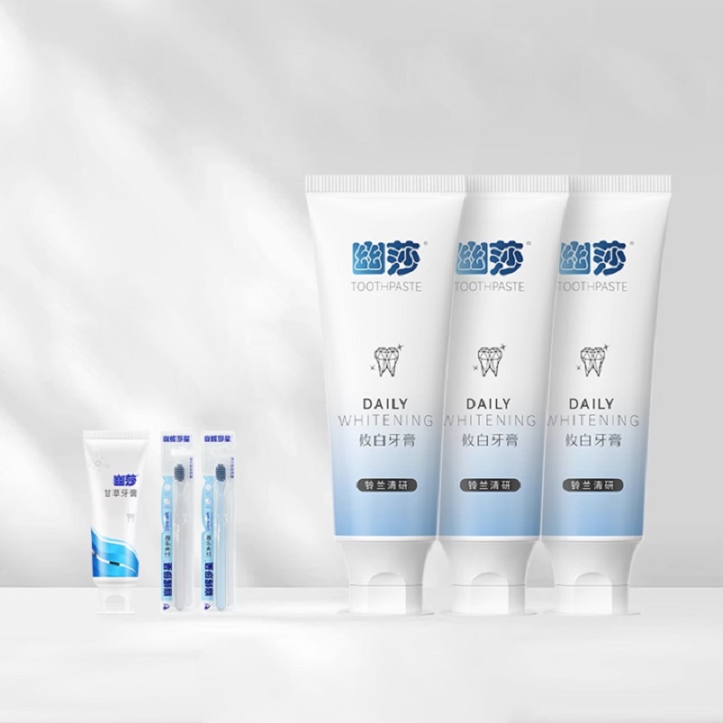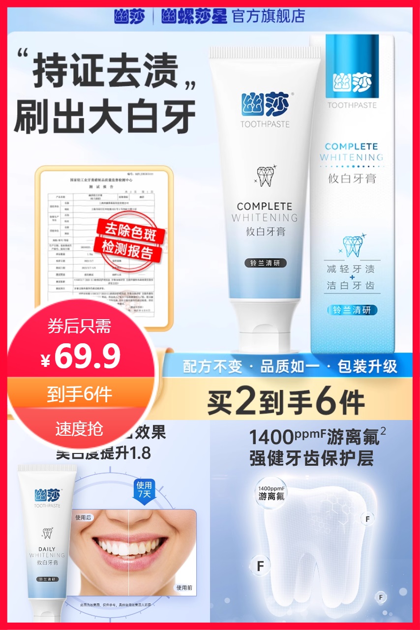 【凑消费券,下拉淘金币和首单,到手约49元,共到手6件】幽螺莎星美白牙膏,1400游离氟离子,添加烟酰胺精华,美白防蛀去渍,持续刷出大白牙,清新不辣口,呵护牙齿健康,买3支送爆款甘草牙膏和牙刷,到手6件,入手不亏