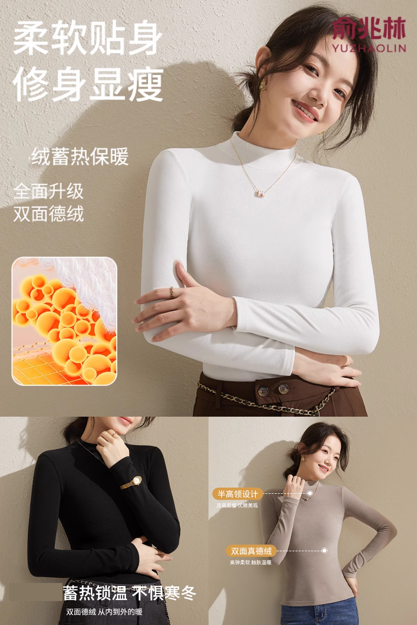 均19.9元1件!限时优惠!叠加淘金币抵扣!俞兆林半高领打底衫,双面加绒锁温保暖,贴身舒适不紧绷,秋冬内搭优选~小立领设计显瘦有型,一衣多穿,基础款也能穿出高级感!温暖质感触手可及,速来带走你的秋冬必备款!