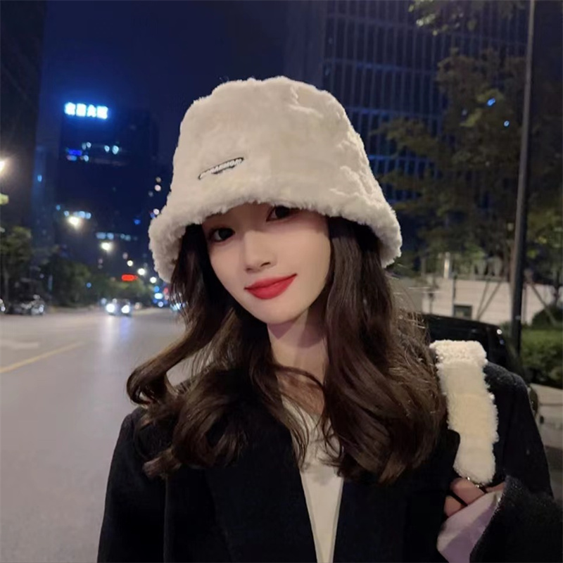 毛绒渔夫帽子女秋冬羊羔绒加厚显脸小保暖韩版素颜黑色水桶盆帽