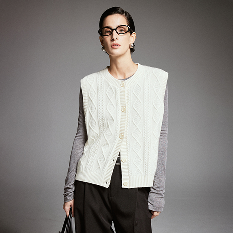 帕罗7G100纯山羊绒衫女秋冬季背心针织马甲圆领绞花开衫毛衣