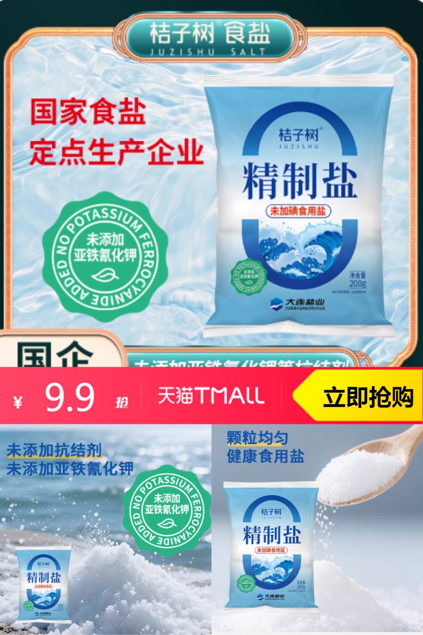 【淘金币0.59元,到手9.31元。】桔子树精制盐未加碘食用盐200g*14袋,未添加抗结剂,未添加亚铁氰化钾。