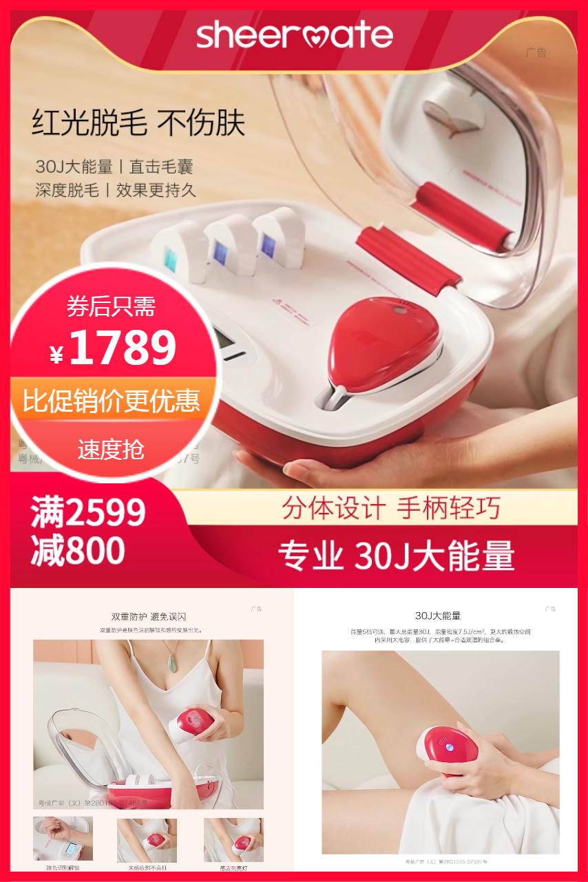 分体设计,手柄轻巧不累,操作便捷更有效,深度脱毛效果更持久,能量5档可选,出光速度可达0.8s/次。