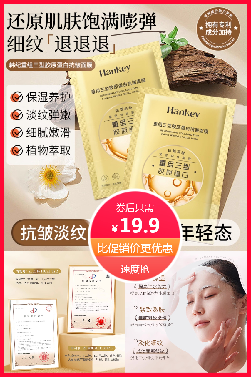【抗皱好选择】韩纪重组三型胶原蛋白面膜,科学抗皱配方,深层保湿紧致,肌肤焕发年轻光采~高端抗皱体验!贴片设计紧密贴合,改善细纹,锁水更养肤!