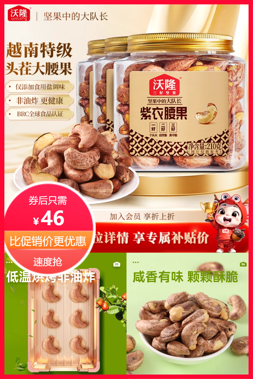 【领礼金+下拉淘金币补贴到手45.99元】沃隆大牌紫衣腰果,精选AA+级别大颗粒腰果,低温烘烤,拒绝油炸,送人自用都很合适,趁活动囤起来吧!