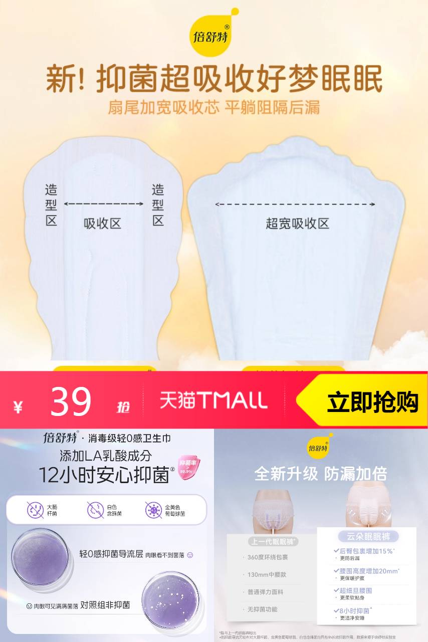 【【任选8件】114元-超级立减64元-41元券=39元,淘金币7.2元,到手31.8元,买8赠柔感棉护垫1包+便携湿厕纸10片装1包】【任选8件到手10】倍舒特高端系列卫生巾,温和弱酸态轻薄空气感,一体锁渗系统净透自在,干爽防漏~