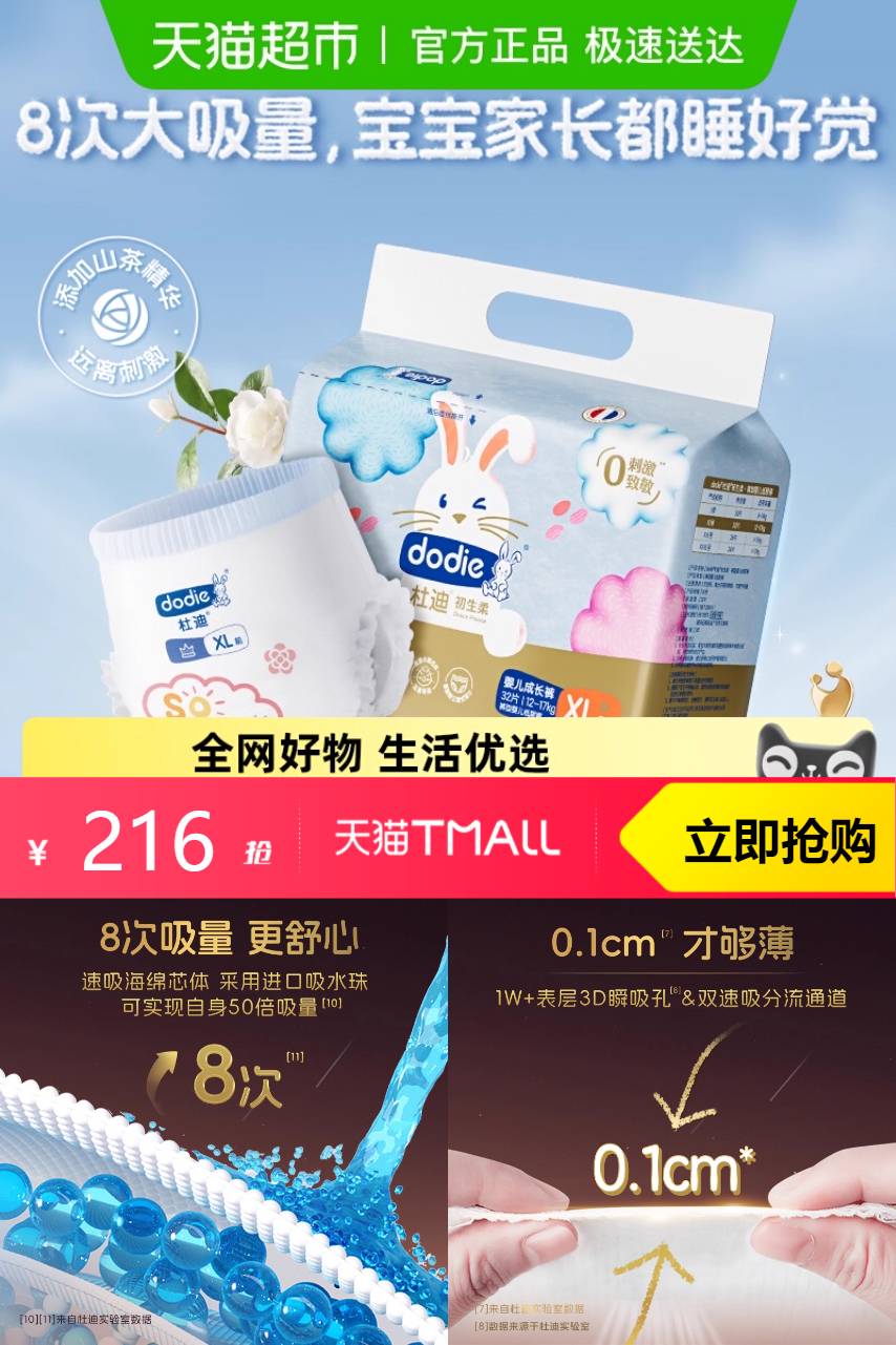 【淘金币抵扣9.52,88VIP专享9.5折减10.8,到手价195.68,折48.92/包】杜迪呵护,初生般的柔软!婴儿拉拉裤,成长好伙伴!吸湿透气,健康每一天!