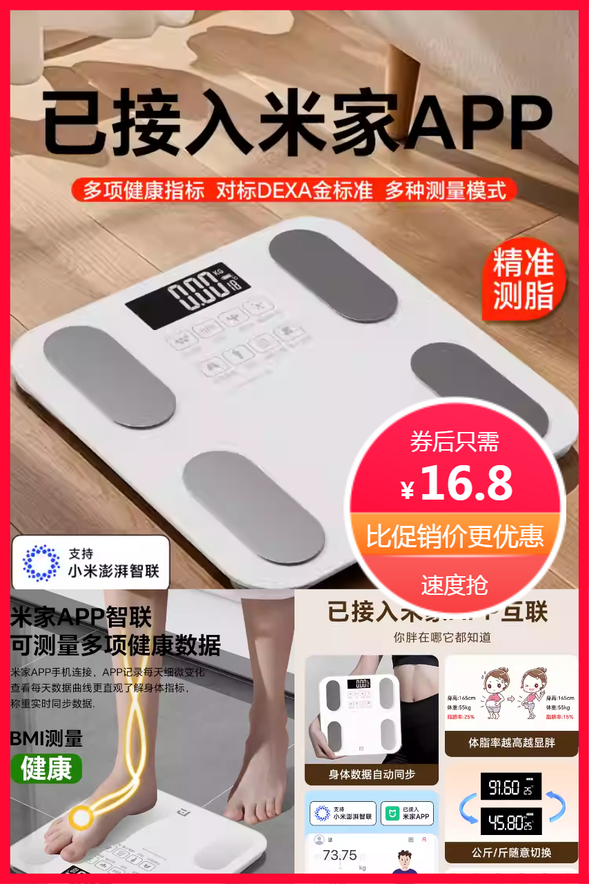 【可签到+官方立减10元+满200减20元到手约9.5元】体重秤家用智能体脂秤2025新款,官方正品,品质保证,米家APP手机连接,记录每天细微变化,蓝牙连接+智能分析,数据一目了然,精准测试体脂/水分,减肥人群必备,多用户自动识别,全家都能用,7天无理由退货