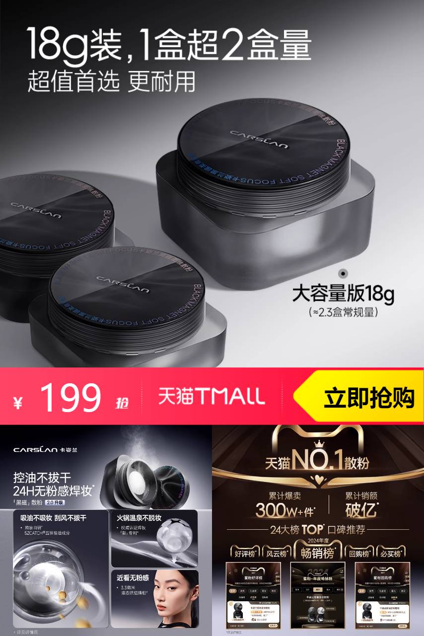 【有到15%!拍大容量常规透明色到手18g!爆品闪购抵扣12.89,淘金币抵20.76元,加入会员凑会员券满减350-50元,叠净值生活券200-15,消费券到手120左右!拍就送黑磁粉饼1.5g装】卡姿兰黑磁散粉大容量!控油防水,焊妆不脱妆,18g超大容量。粉质细腻不卡粉,上脸秒哑光