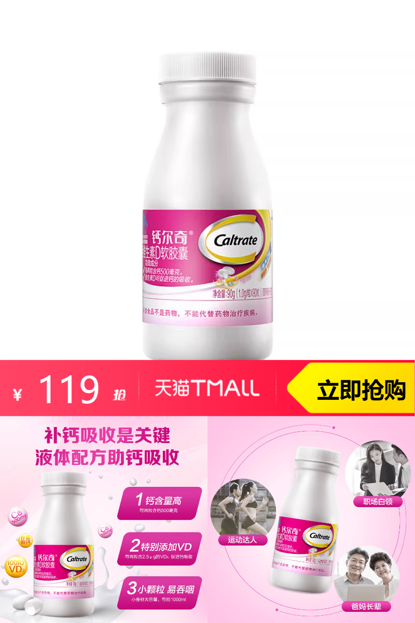 【直播间加购抵3元+88vip抵扣5.8元+淘金币抵扣7.98元+凑单消费券200-25+返健康卡10元=到手仅需79.44元。合计单粒0.26元】返卡!钙尔奇液体钙90粒*3瓶加赠28粒,易吸收液体钙小颗粒易吞服。不同于传统钙片,其采用特殊配方,让你每天只需一颗,轻松满足身体对钙的需求。