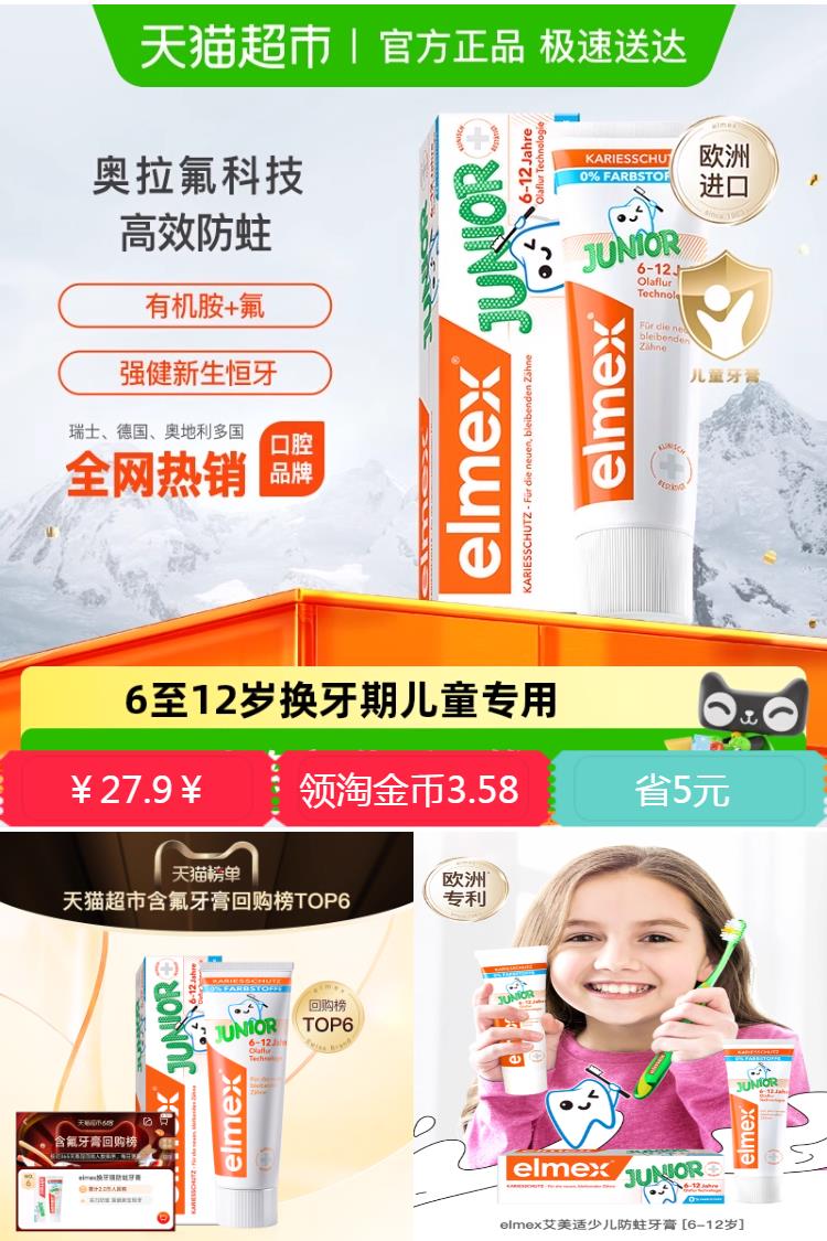 【淘金币3.58元+1元新/老客+88会员1.35元后到手21.9元】elmex艾美适儿童牙膏为儿童0-6岁,6-12岁换牙期设计,含氟配方科学防蛀,温和不刺激,德国原研品质守护萌牙健康。