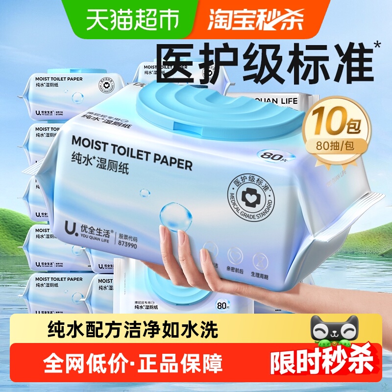 10包|优全生活纯水湿厕纸80抽M码加大尺寸男女清洁厕湿手纸家庭装