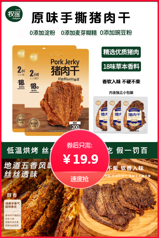 首单+立减到手约15元!大片整切,肉质好 纤维纹理分明,越嚼越香。精选优质猪肉,18味草本香料,香软入味 不硬不柴,肉足量大,解馋又饱腹。单独小包装锁住新鲜又方便,随身携带想吃就吃。不拿包装凑克数,分量足,0添加淀粉 0添加麦芽糊精 0添加豌豆粉,放心购。
