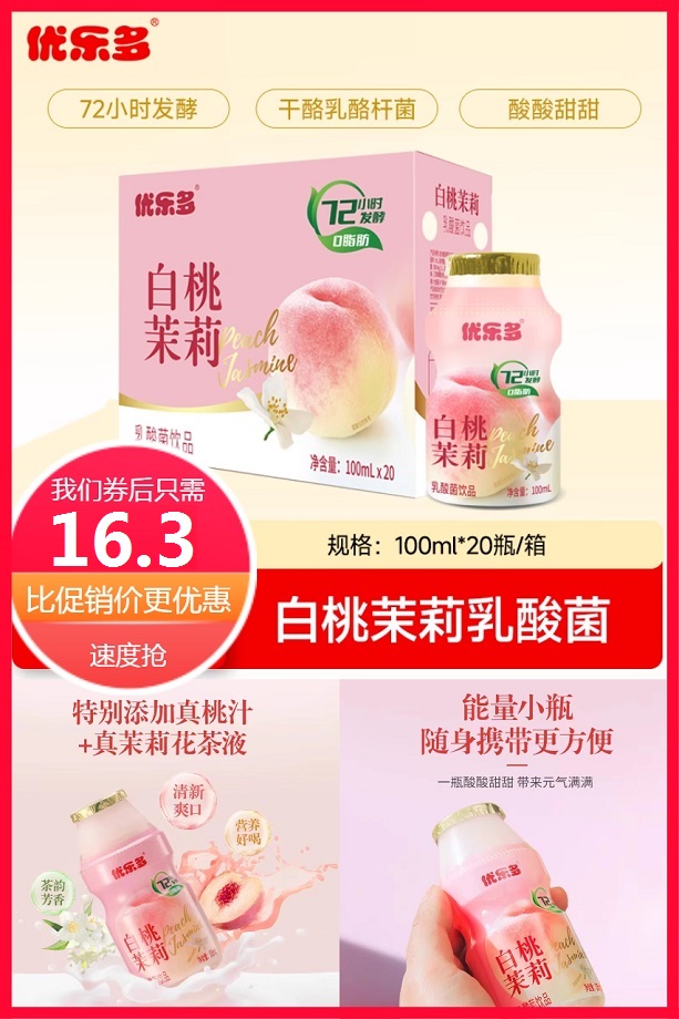 【立减3.6元,淘金币可抵1.49元,折0.74/瓶】青提栀子花味、白桃茉莉味、经典原味可选!每天一瓶优乐多乳酸菌饮品,呵护肠胃!常喝肠轻松,进口优质奶源,72小时低温发酵,清爽果香,解腻助消化,0脂肪不怕胖,老少皆宜!