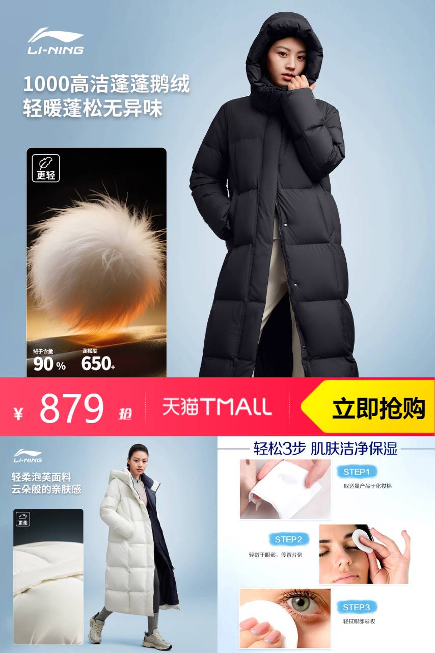 【叠大额券1000-160,消费券,9.5折购物金后到手约709左右,得物769起步】李宁火锅羽绒服丨冬季2025新款长款衣服女款连帽鹅绒保暖运动上衣!!