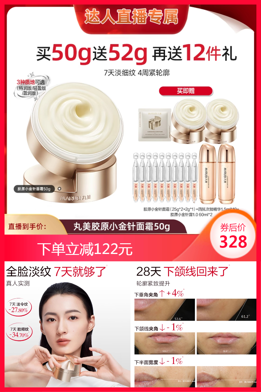 【官方立减54元,消费券减20元到手约308元,买50g送52g,再送12件礼(胶原小金针面霜(25g*2+2g*1)+四抗次抛精华1.5mml*10+胶原小金针露1.0 60ml*2)】保湿 + 紧致 + 淡纹!重组胶原蛋白!改善细纹和皱纹!加强防御修护!使皮肤更加光滑柔嫩,增强韧性和强度!关键MARUBI品牌保证!!