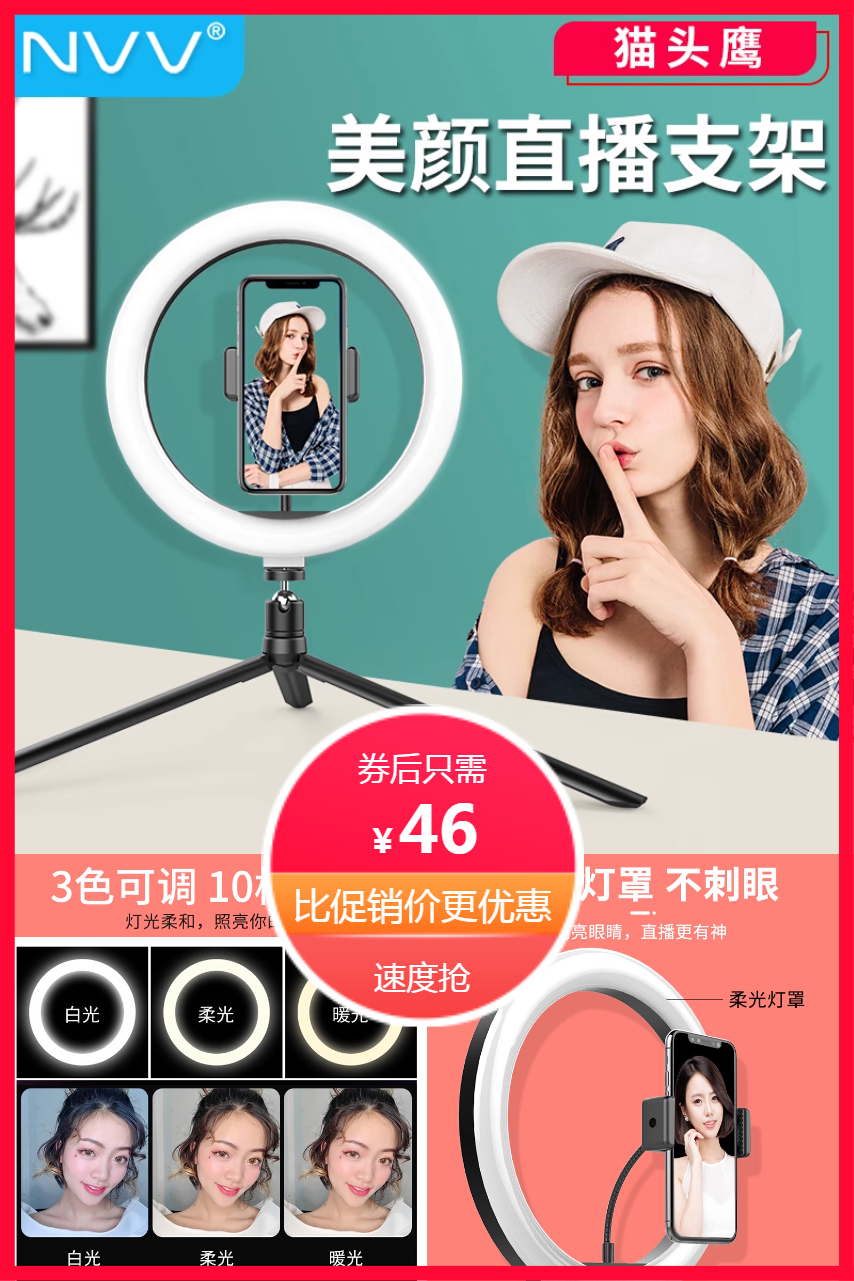 NVV直播支架三合一!桌面三脚架+美颜补光灯+手机夹,抖音快手自拍直播稳如专业棚拍~自带双环形LED补光灯,无级调光不刺眼,柔光美颜不修图也上镜!