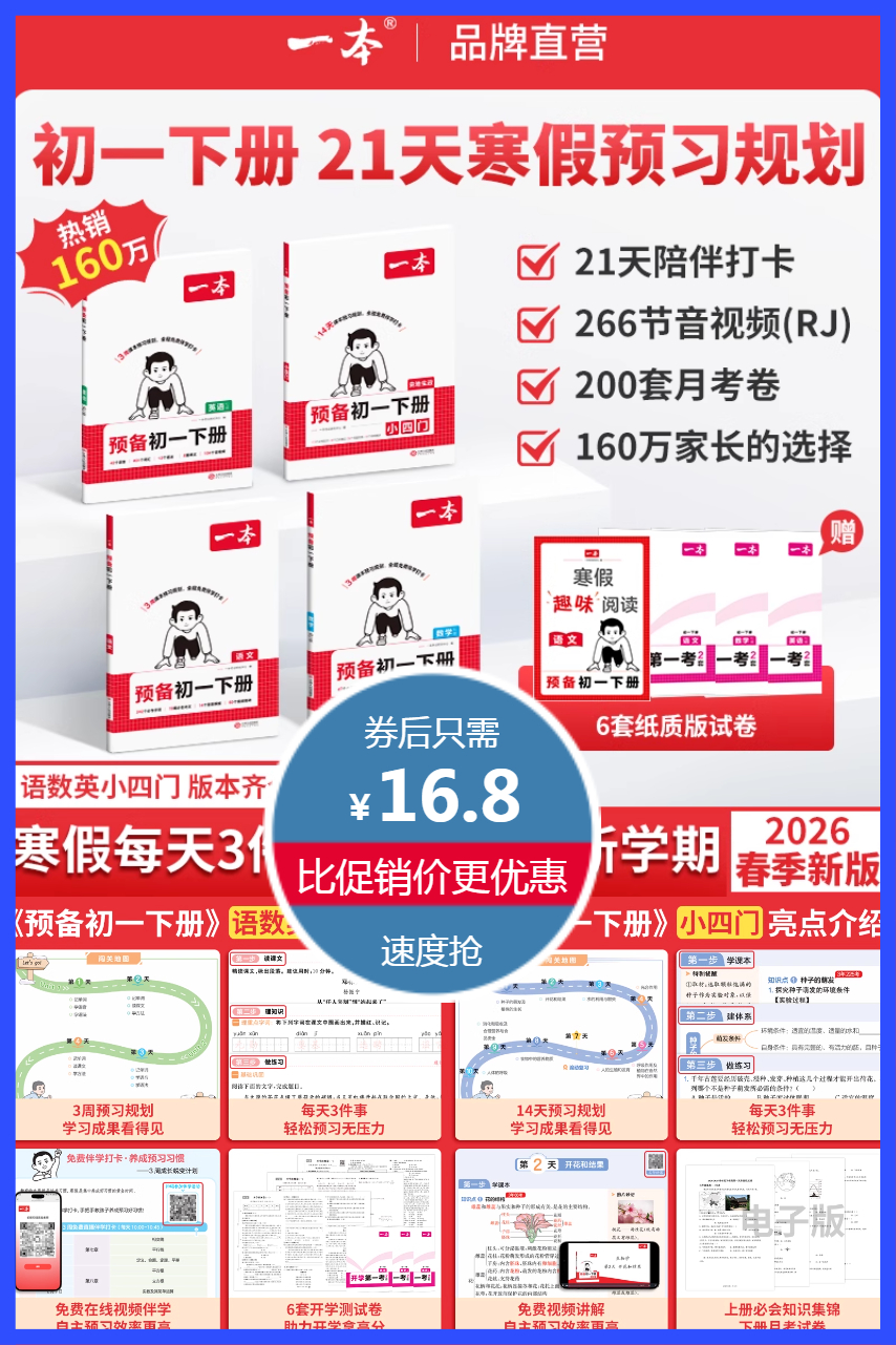 送6套纸质版试卷!一本预备初一下册课本预习科目任选,语数英、小四门版本齐全任选,21天寒假预习规划,21天陪伴打卡,266节音视频(RJ),200套月考卷,160万家长的选择,寒假每天3件事 开学领跑新学期