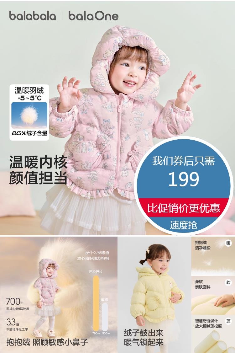 【叠加消费券立减20元】2025新款巴拉巴拉儿童羽绒服,软奶皮亲肤面料,轻、软、糯,85%绒子含量,足量充绒,锁绒力MAX的锁温系统,不怕热量流失,多个颜色可选,冬季必备保暖羽绒服!