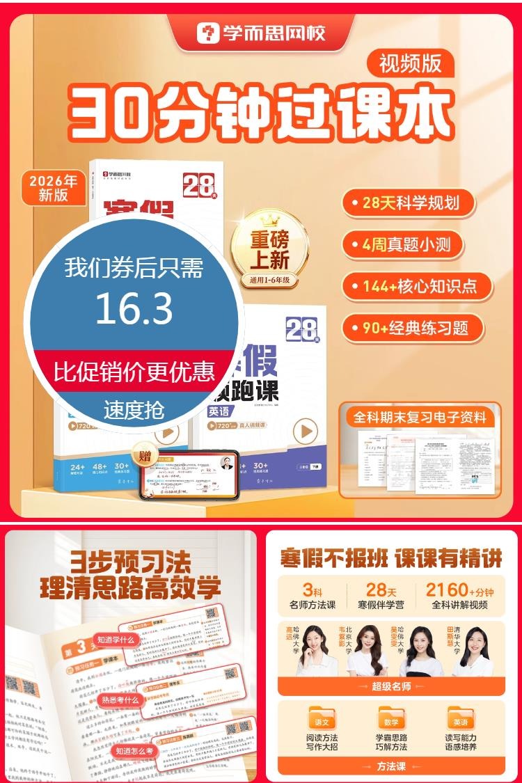 【赠全科期末复习电子资料】小学28天寒假领跑课,28天科学规划,4周真题小测,144+核心知识点,90+经典练习题,3步预习法,理清思路高效学,1:1同步人教教材,每天30分钟过课本,扎实衔接新学期