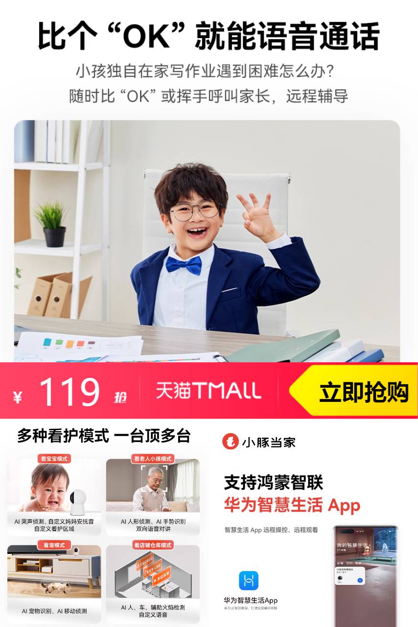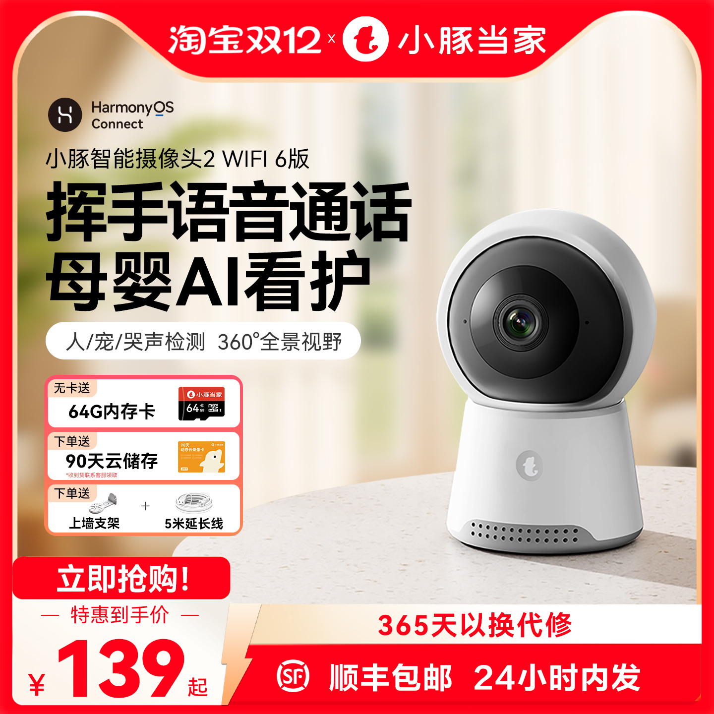 【淘金币抵4.92,凑160-20消费券到手99.8元;赠64G内存卡+90天云储存+上墙支架+5m延长线】小豚当家远程夜视家庭监控【鸿蒙系统】,AI小战士,上全能看家。