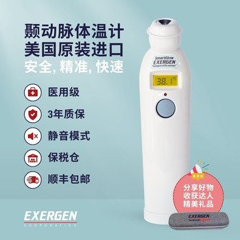 【全球热销】Exergen颞动脉体温计,为您的健康保驾护航。这款测量仪不仅快速,而且无需接触皮肤,适用于所有人,包括老人、小孩及孕妇。您只需将它贴在额头或手腕上即可获得体温数据。使用简单方便,让您随时随地了解自己的身体状况。