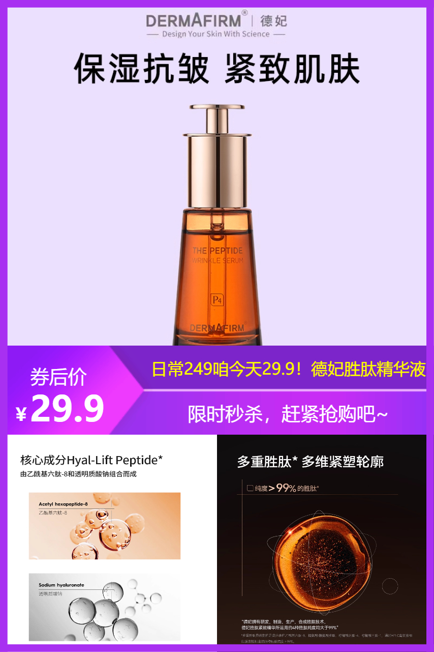 【德妃胜肽精华液】抗老党必冲!高浓度胜肽直击细纹,修护紧致双在线,补水保湿不粘腻~日常价 249 元,今天仅 29.9 元!错过再无这个价,护肤刚需闭眼入,囤货趁现在,嫩脸不等待!