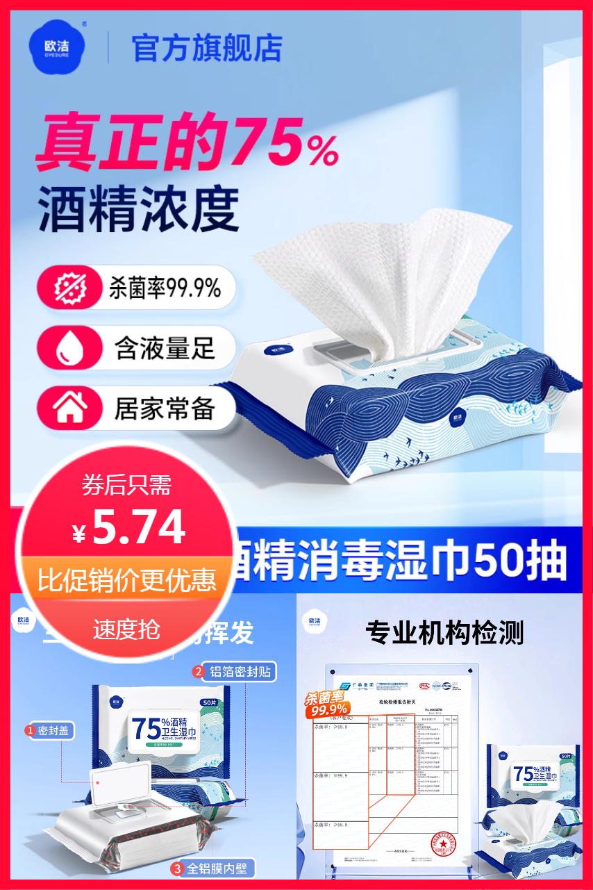 可签到+官方立减1.06+消费券满160元减20元到手更优】限时直降‼欧洁酒精湿巾,真正的百分之75酒精湿巾,杀菌率高达百分之99.9,含液量足,消字号认证,有效对抗病毒,呵护健康,三层密封,不易挥发,湿润升级,入手一包,呵护无忧!