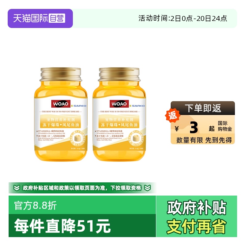 【自营】SANKO联名WOAO冻干凤尾鱼油猫狗美毛护肤适口性好2瓶