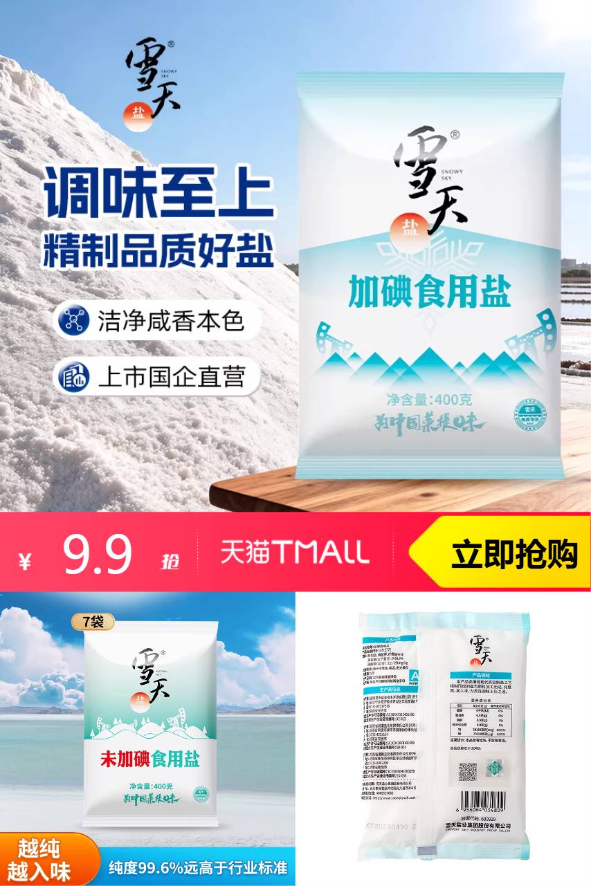 【淘金币抵扣0.25元,到手价9.65元】雪天高纯度食用盐,氯化钠含量99.6%,无抗结剂,颗粒均匀易溶解,适合烹饪、腌制多种场景。独立包装防潮便携,家庭常备优选!