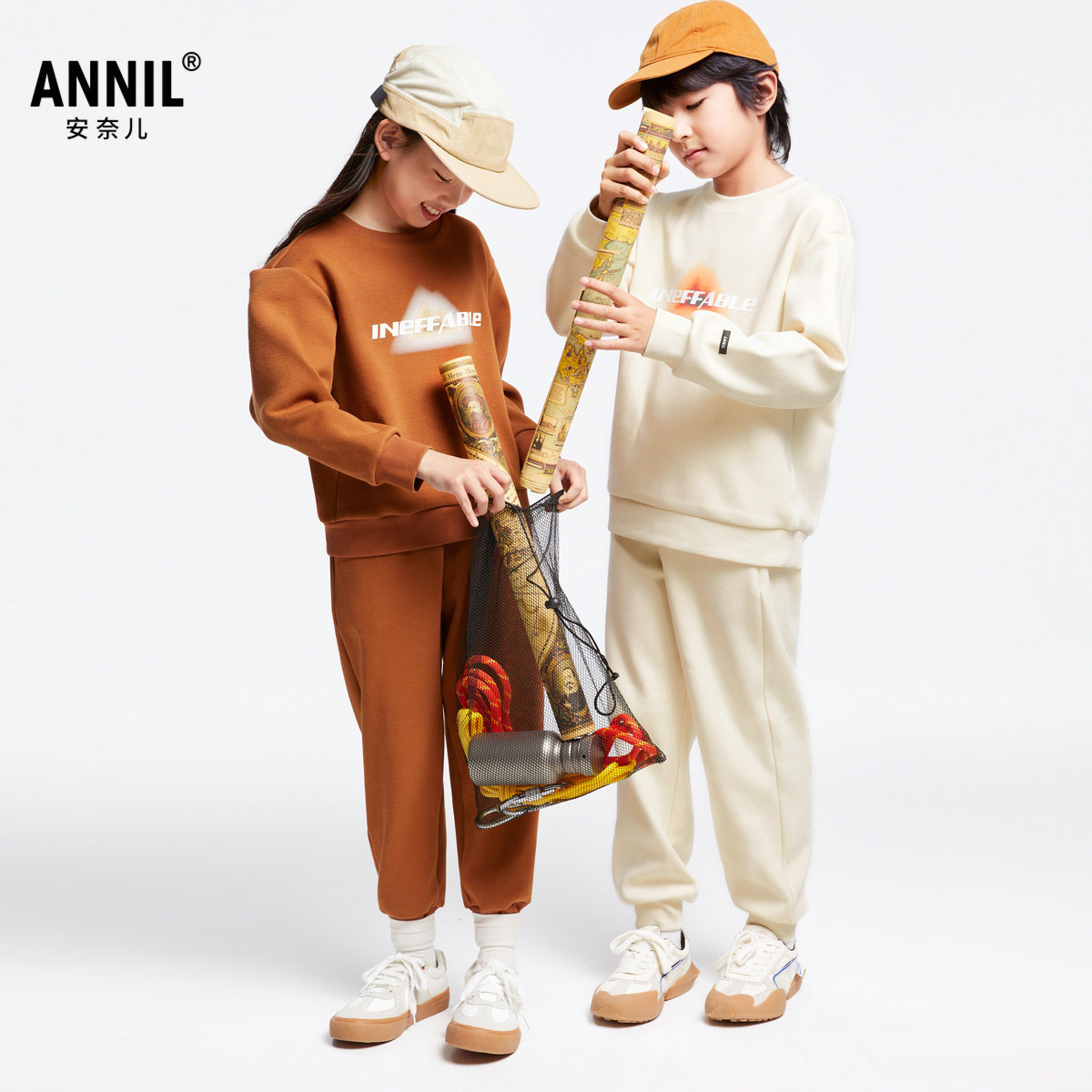 安奈儿童装男童女童圆领卫衣套装2024冬运动户外休闲加绒保暖印花