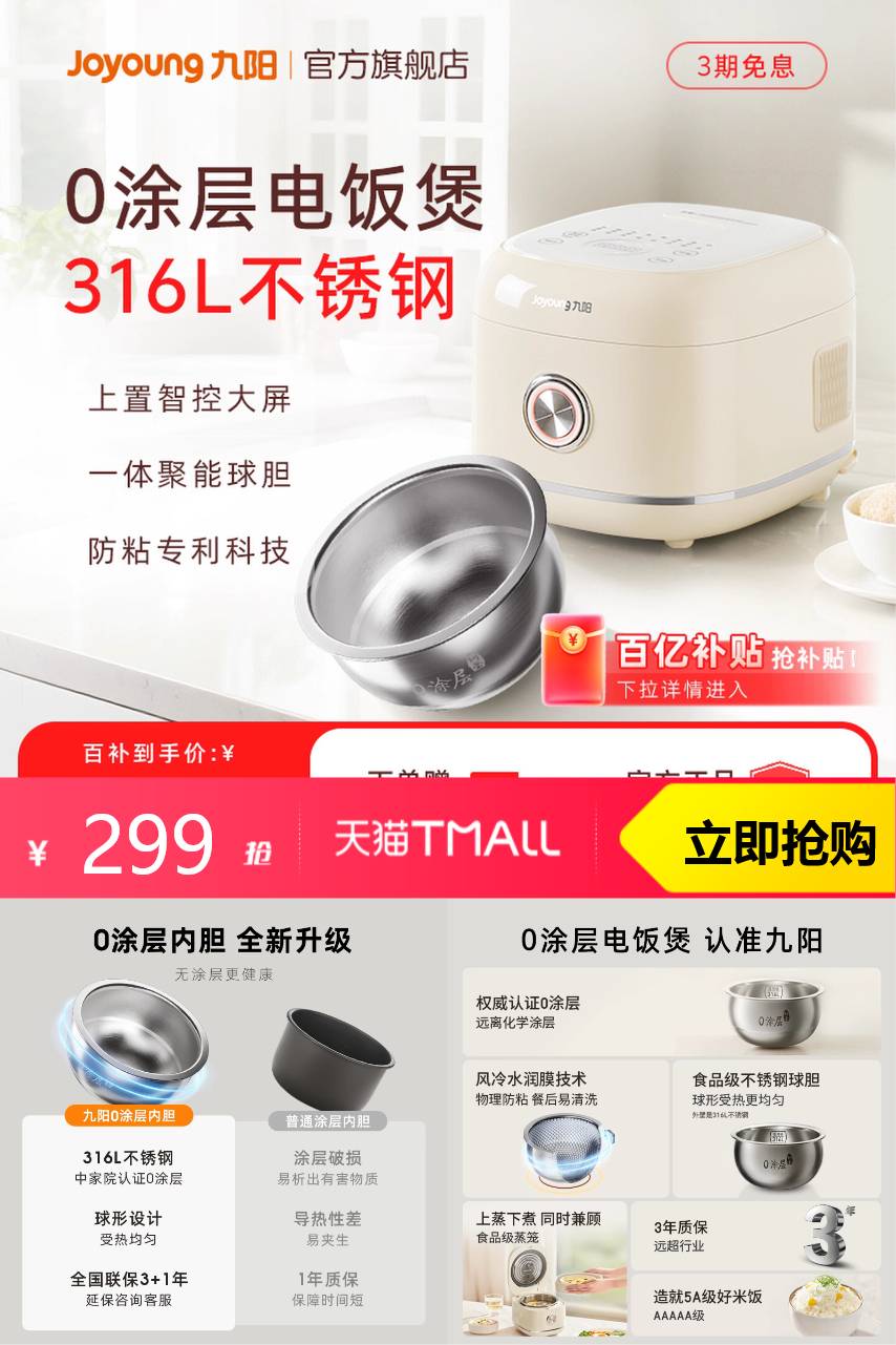 【淘金币+消费券到手250】九阳0涂层电饭煲,打破传统电饭煲的局限,带来全新的烹饪体验!