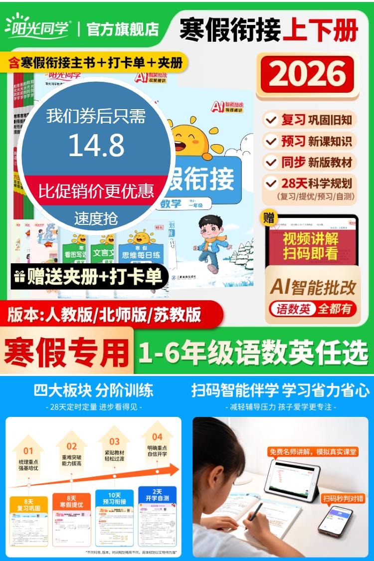 【赠夹册+打卡单】2026春新版阳光同学寒假衔接,复习巩固旧知,预习新课知识,同步新版教材,扫码智能伴学,减轻辅导压力,孩子爱学更专注,寒假28天高效衔接,开学自信领跑!