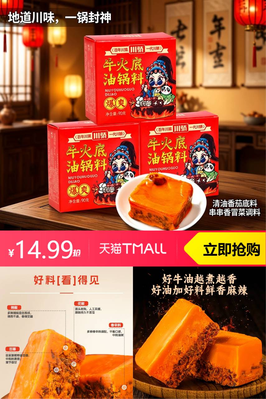 【原价53.40,领卷减32,官方立减6.41,到手14.99。】川骄牛油火锅底料,90g独立小包装!精选四川牛油+多重香辛料,麻辣鲜香地道川味,串串香、冒菜、家庭煮锅一料搞定~