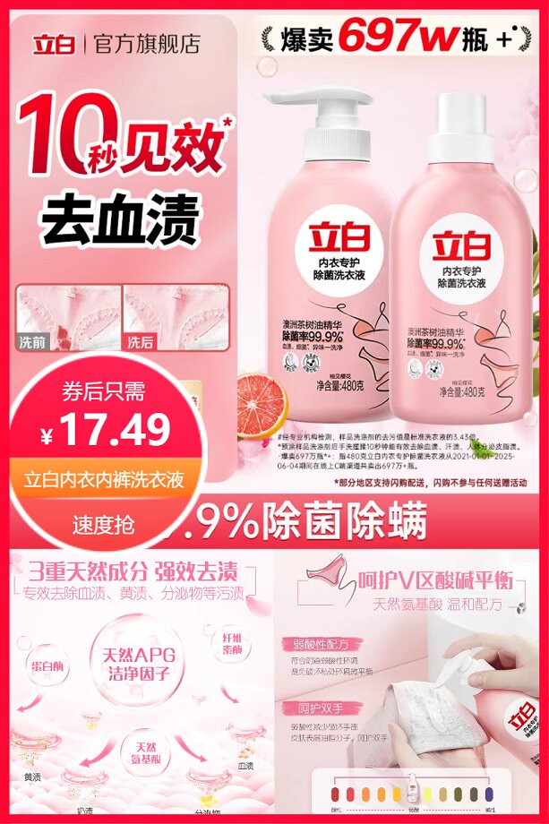 超级立减6.2元+券15元+淘金币省2.41元后约17.49元,内衣内裤洗衣液!弱酸性配方~7大0添加,强效去血渍~有效除菌除螨,48小时长效抑菌!