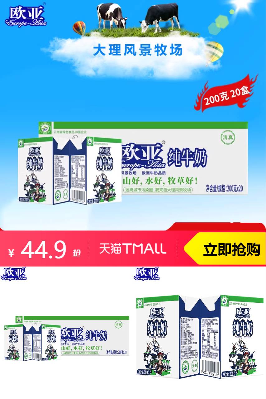 【减淘金币1元,减限时红包2元,叠平台满200减25消费券和彩云电商券满100减15,到手价29.01元。】好牧场,好牛奶。欧亚牛奶产自风景秀丽的大理风景牧场鹤庆牧场海拔2198米,近十年年均日照2617小时,全自动无菌灌装、菌种在线添加、无菌空气保护等