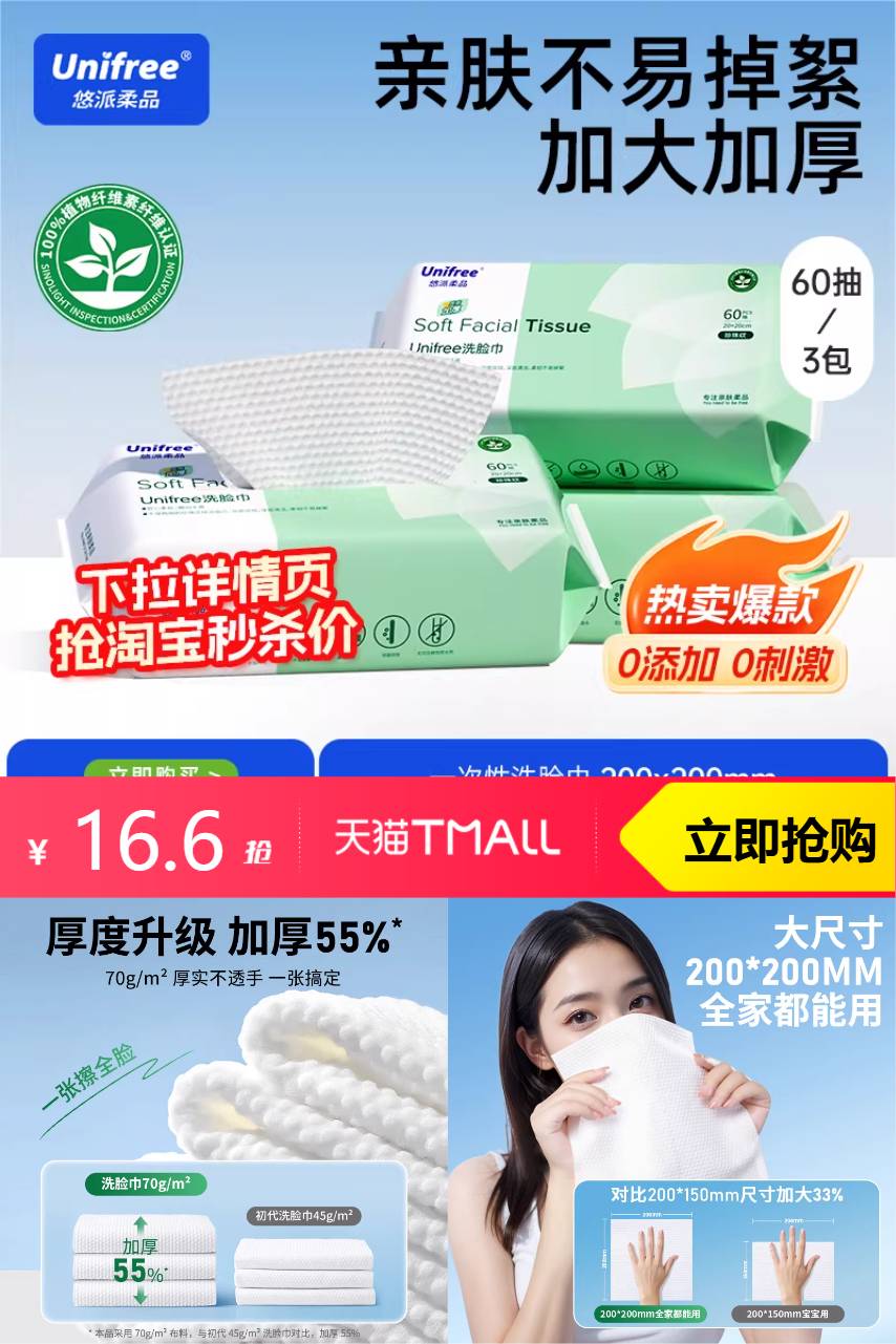 【官方限时补贴8.3,淘金币0.24,到手价16.36.】采用纯棉,纯净呵护!防止皮肤刺激和损伤,每天给您的脸部温柔抚触。