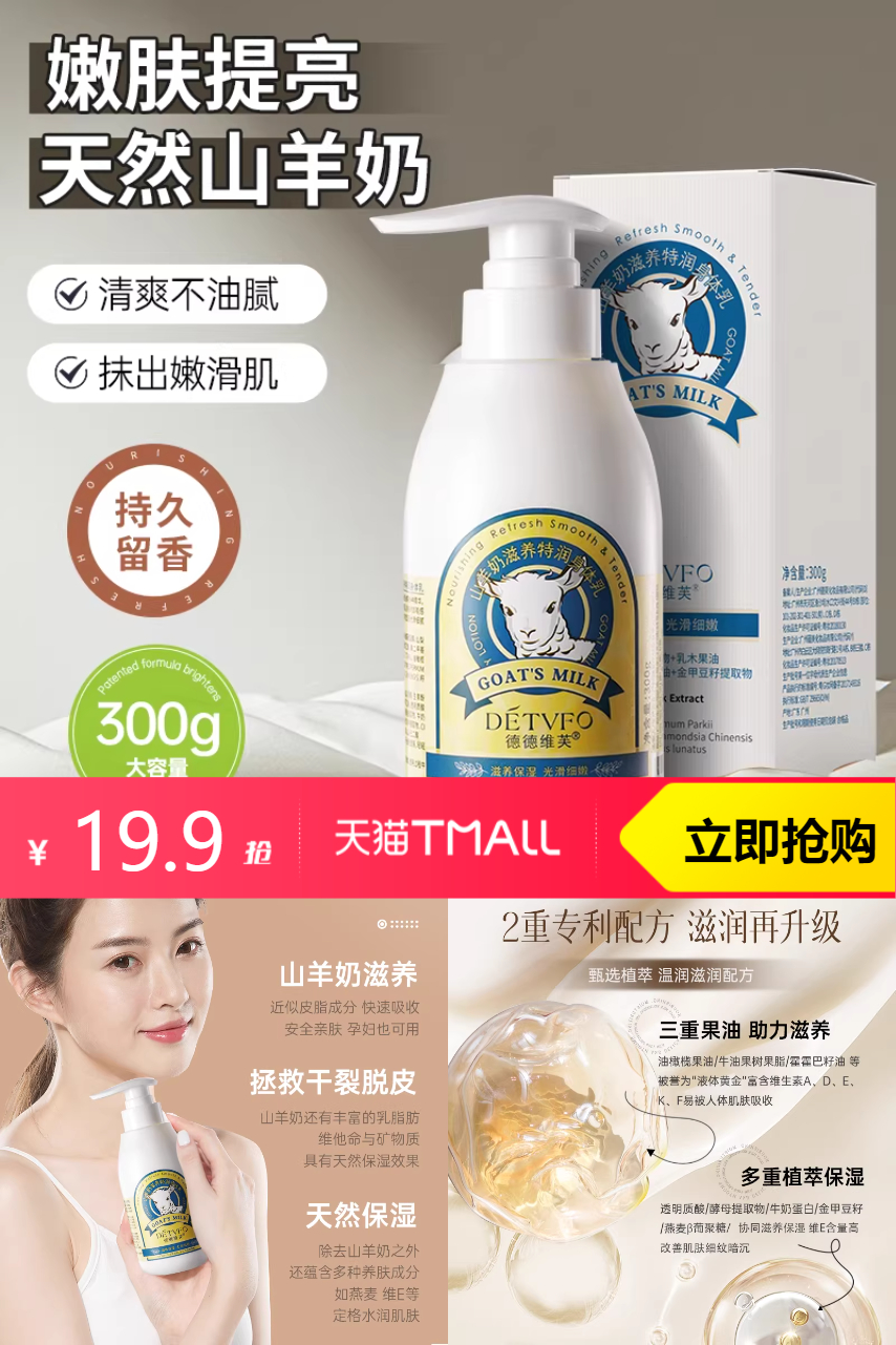 【官方立减6 淘金币1.5到手18.4】德德维芙山羊奶身体乳保湿滋润皮肤补水护肤,高滋养,速补水,滋养干皮,光滑细嫩~