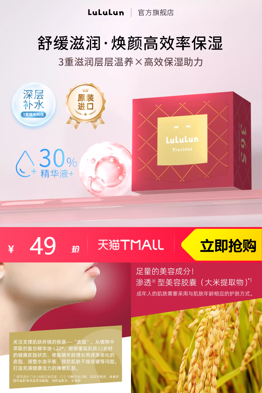 【原价181-优惠券110-立减22-淘金币10.43=到手价38.57】LuLuLun驻颜高保湿面膜32片,仿佛时间都静止了,我深陷于这种极度的放松中,如同呵护着我的灵魂与肉体。