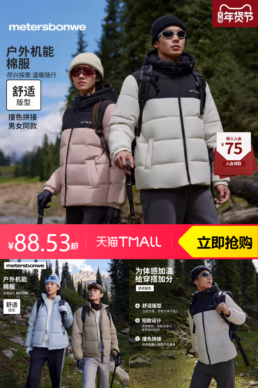 【立减30+淘金币5.97+淘礼金10.5到手88.53元+88vip抵扣5.25+叠加消费券抵扣11.72到手71.56元】这款美特斯邦威棉服,设计上可是别出心裁,撞色设计超级吸引眼球!不同颜色的线条巧妙融合,活泼又醒目~