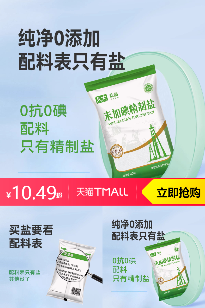 【淘金币抵扣0.51,到手价9.98】 久大未加碘盐,健康之选,无添加更纯净!加碘精纯盐,营养又美味。