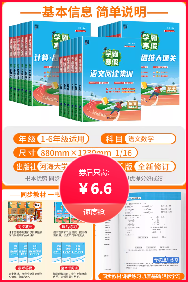 寒假作业不焦虑!人教/北师大/苏教版全适配,语文阅读+数学计算+思维训练三合一,科学衔接新学期~超.值性价比,覆盖1-6年级上下册,预习复习双保障,家长省心孩子进步快!假期努力,学业不辜负!学霸之路,从此开启!精选内容,助你领先一步!个性化学习,进步看得见!