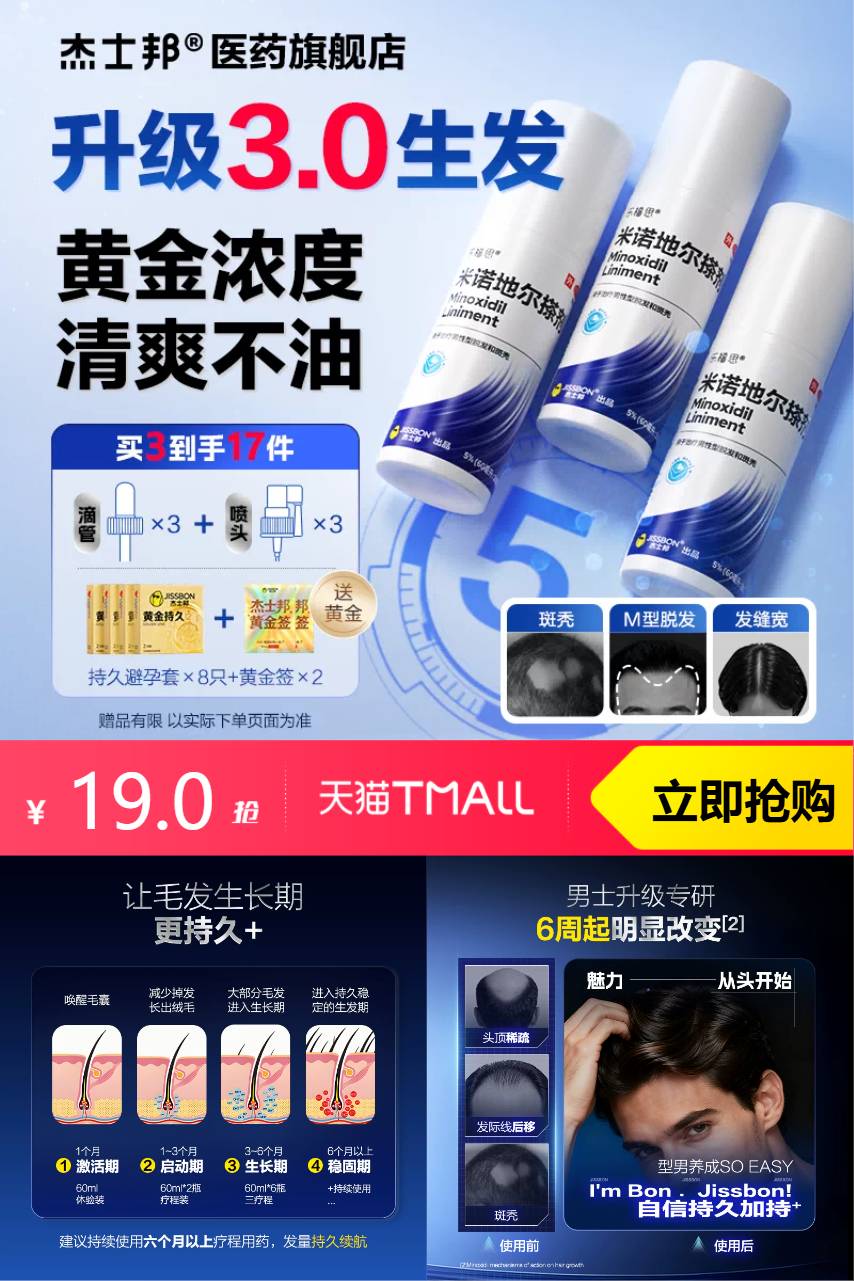 【淘金币抵1,叠消费劵到手16】抱着死马当活马医的心态入了杰士邦5%米诺地尔搽剂,结果直接给我整惊艳了!5%浓度真的是男士防脱的黄金浓度啊,比低浓度的见效快多了,而且是持证上岗的正规品,用着巨安心!