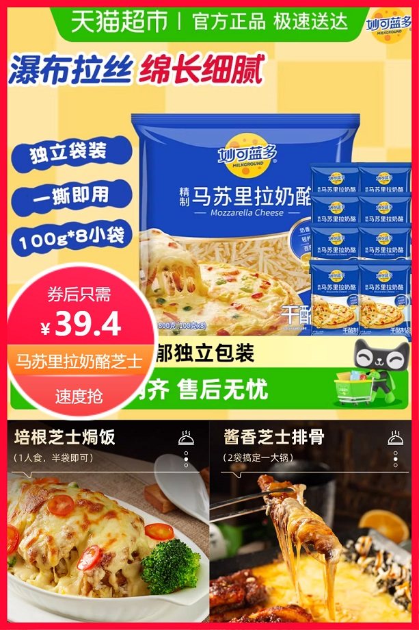 1.13号早8点下拉下拉详情进直播间领取8元红包到手34.15元更实惠,秒杀立减20.1元+券5元+88vip省2.25元+点击有上角三个点进入淘金币抵扣5.5元后约37.15元,喵满分×妙可蓝多,精制马苏里拉奶酪,烘焙原料芝士碎,800g,内含8袋独立包装,定量取用,一次一袋刚刚好,奶香浓郁,轻松拉丝!