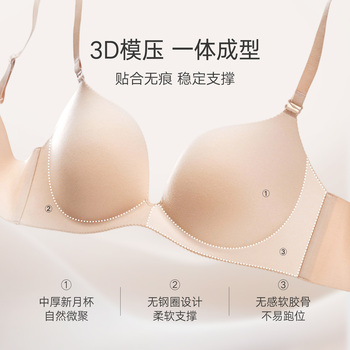 自然贴合,穿得舒适。中厚新月杯自然微聚,无钢圈设计柔软支撑,无感软胶骨不易跑位,微聚拢,穿出好胸型。