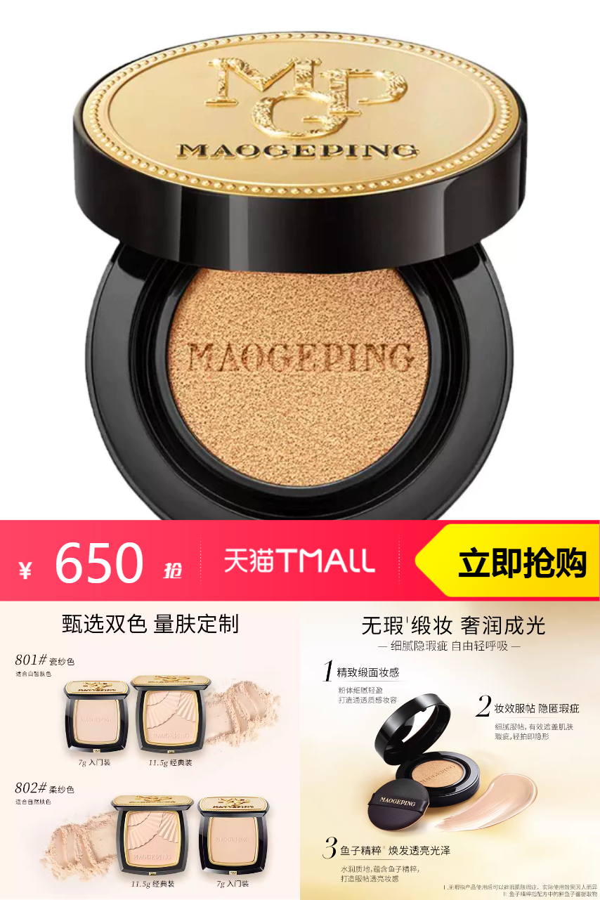 【原价850-官方立减102-立减优惠88-商品券10-淘金币32.5-美妆惊喜券66.11-消费券35左右=到手516元左右。到手鱼子酱气垫14g+替换芯14g+小金扇粉饼7g+黑霜7g+柔纱粉扑+新年限定包装+新年限定冰箱贴】