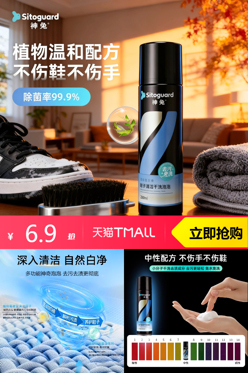 【原价29.9-淘客券23-淘金币0.6=6.3,送刷子毛巾】神兔小白鞋清洗剂280ml,喷完不用冲洗,天然柠檬精油去污效果强劲!清爽的清香让您感受到舒适的护足体验!