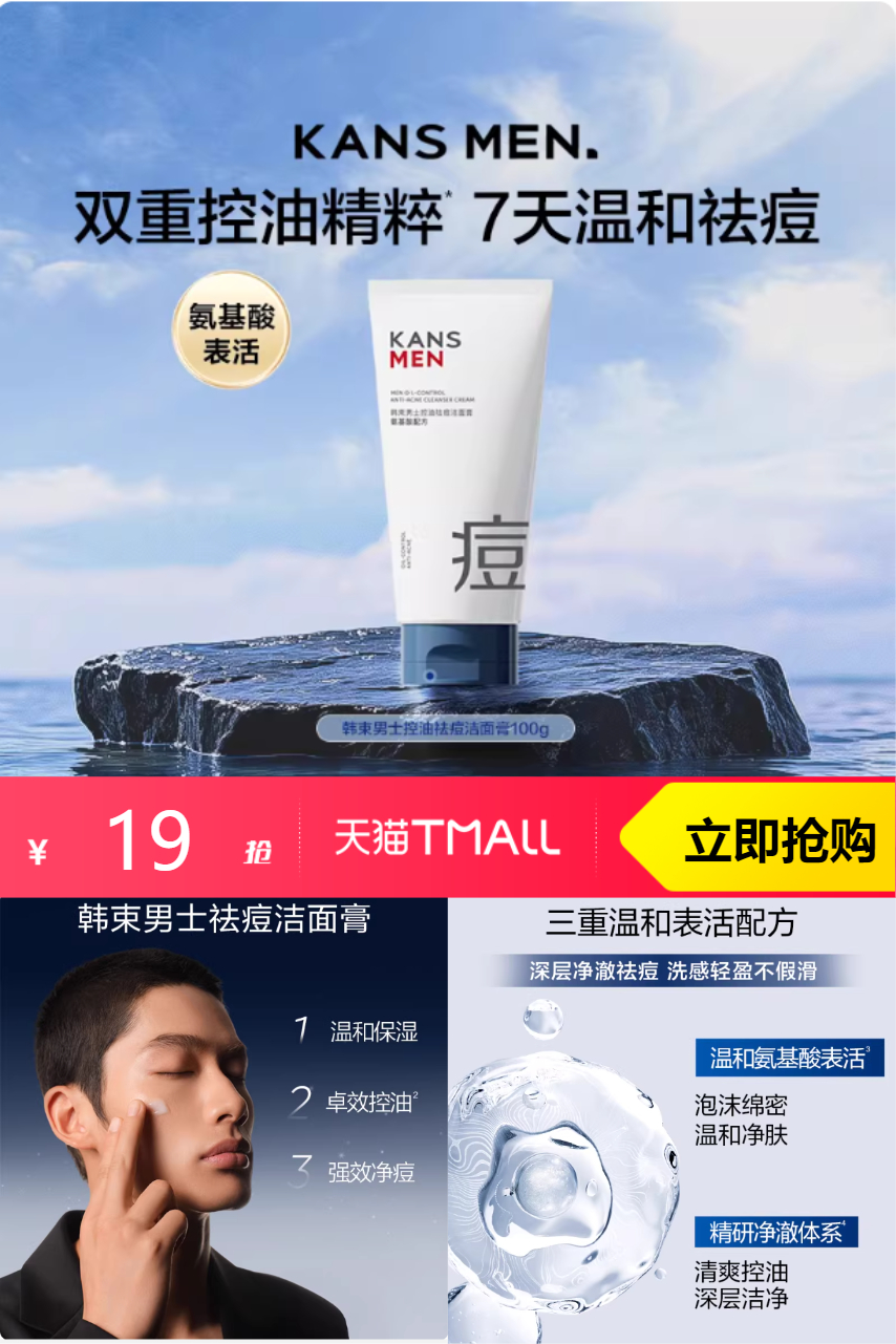 【88vip抵0.95,到手18元,折合9元/支】韩束男士洁面100g*2,双重控油精粹,7天温和祛痘。