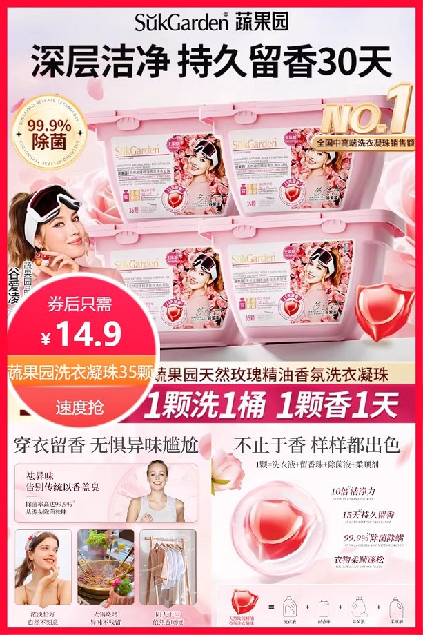 券15元+淘金币抵扣0.6元+限时红包1元后约13.3元,蔬果园玫瑰洗衣凝珠,天然玫瑰精油,持久留香15天,除菌除螨,10倍洁净力,衣物柔软蓬松!券15元+淘金币抵扣0.6元后约14.3元,蔬果园玫瑰洗衣凝珠,天然玫瑰精油,持久留香15天,除菌除螨,10倍洁净力,衣物柔软蓬松!