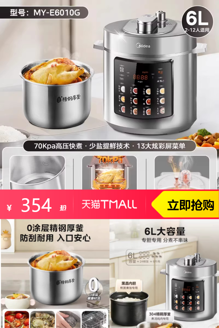 【满5.01减5元,超级立减49元,限时立减79元,淘金币抵扣43.83元,到手价310.17元。】美的电压力锅6L升炫彩屏菜家用不锈钢,品质优选~